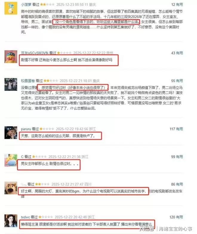 最后就是演员的演技问题,宋威龙前几集戏份不多,不做评价,赵今麦的演技中规中矩,其他演员的演技都透着一股做作感,非常不接地气。