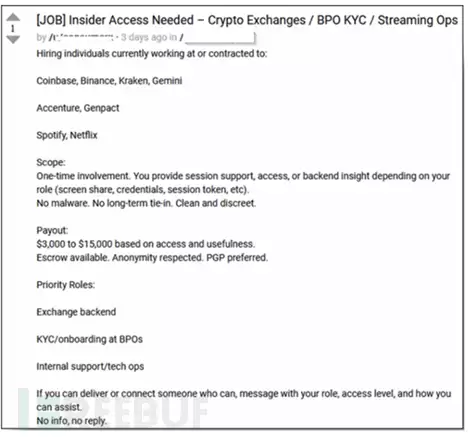 值得注意的是,几乎所有行业都面临威胁。招募广告中明确提到Coinbase、币安、Kraken和Gemini等加密货币平台,埃森哲、简柏特等咨询公司,以及Spotify、Netflix等消费品牌均被点名。