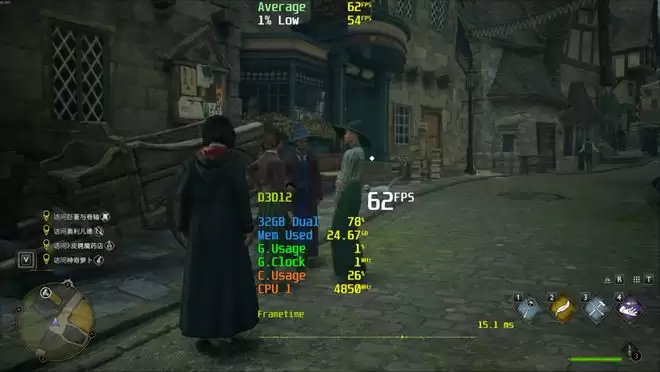 ▲在16GB×2内存、1080P+低画质设置下,玩《霍格沃兹之遗》的系统内存占用大概8.7GB左右(平均26fps)