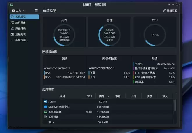 ▲即便是在桌面模式下,SteamOS开机后内存占用也只有3.4GB左右,游戏模式下少了一些后台程序,占用只有2.5GB左右
