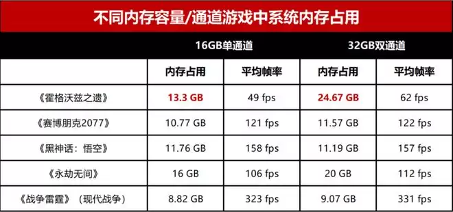 可以看到,还不用经营模拟游戏上场,就算是《霍格沃兹之遗》这样的3A游戏,游戏中的内存占用也非常高,只使用16GB单通道内存的情况下,游戏平均帧率下降比较明显。而我们知道,一些经营模拟类游戏玩到后期更是内存杀手,16GB内存是显然不够用的。不过,对于一些对内存容量要求没那么高的游戏来讲,16GB游戏也是可以保证畅玩的,所以大家在玩自己常玩的游戏时可以注意一下系统内存占用情况,再来决定是否卖掉一条内存。此外,大家还可以看到,在分别搭配16GB和32GB内存时,玩同一个游戏的系统内存占用量也是不同的,这是Windows系统和应用程序的内存占用机制所致,遇到系统内存更大,它们也会占用更多内存进行数据交换,从而提升效率和流畅度。