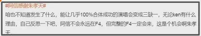 朱孝天缺席F4演唱会的争论不休,在阿信补位登台摔倒受伤的情况下,不少歌迷劝他离开F4的演唱会,阿信针对此事做出多番回应,他先是在演唱会现场感谢暂未奔赴的朱孝天,承诺自己会回归五月天,给外界传递了朱孝天有可能回归F4完整体的信息。