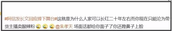 不少网友看到朱孝天的回应,也表示怪不得阿信可以长红二十年,而朱孝天只能沦落到当带货主播,吐槽这情商低到场面话都不接,还蹬鼻子上脸也是难评。同时,也有网友让朱孝天好好反思,不管F4变F3的具体原因是什么,他目前的表现都无法让人放心。