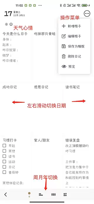 打开反思日记app,你会发现主界面的设计非常直观,能够轻松查看每天的记录内容。手指在屏幕上左右滑动,就能快速切换到不同日期的日记,操作简单又流畅。你还可以根据自己的喜好,自定义编辑格式,通过拖拽来调整条目顺序。如果想修改某条内容,轻轻点击就能进入编辑状态。通过底部的操作栏,你可以随时为日记添加标签、插入图片等丰富元素。点击右上角的按钮,则可以在不同视图模式间自由切换。