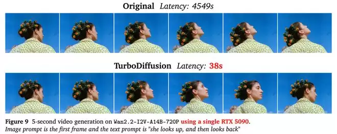 对于14B大小的文生视频模型生成5秒的720P分辨率视频,TurboDiffusion可以在单张RTX 5090上几乎无损端到端加速200倍。