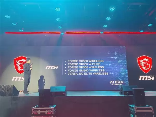 键鼠外设部分,微星主要介绍了五款产品,分别是三款接盘FORGE GK500 WIRELESS、FORGE GK600 W DUKE、FORGE GK300 WIRELESS,两款鼠标FORGE GM500 WIRELESS和VERSA 300 ELITE WIRELESS,并预告了魔龙姬联名款-VERSA WIRELESS MLG EDITION鼠标,整体采用"魔焰红"配色,融入了MLG的标识元素。