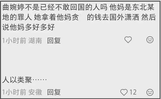最近曲婉婷和她的罪犯母亲连上三条热搜,分别是“曲婉婷账号没了”、“曲婉婷母亲滥用职权致2 3亿损失”、“曲婉婷多年来从未公开道歉”,每条热搜话题下方都有质量很高的网友留言和媒体评论。面对曲婉婷一家,
