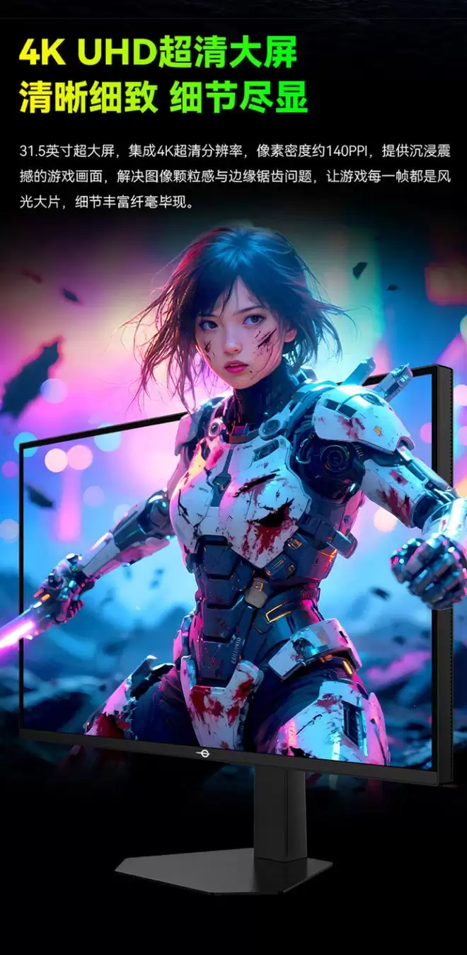 设计方面,这款显示器拥有全新“高亮”模式,可根据各分区 APL 动态调整背光亮度,号称可让 SDR 画质“媲美 HDR”,4K 模式下屏幕像素密度(PPI)可达 140,解决颗粒感与边缘锯齿问题,带来更清晰画面,GTG 响应时间可达 0.001 秒,满足电竞玩家需要。