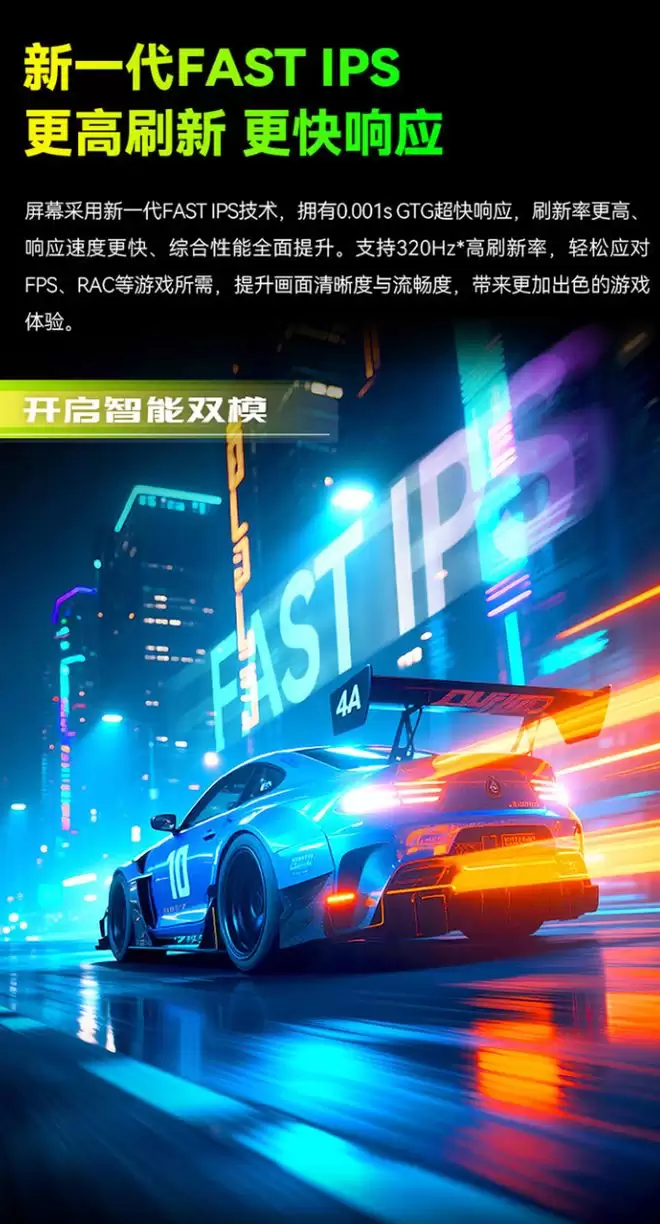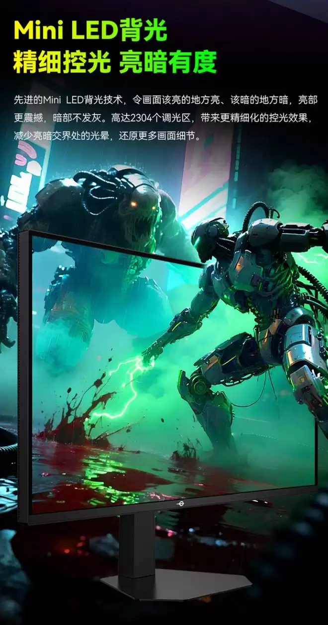 据介绍,这款显示器搭载旗舰级双模显示面板,4K 和 1080P 两种模式兼顾高清晰度、高刷,满足 3A 和 FPS 游戏需求,配备 Mini LED 背光技术,拥有 2304 个调光区,可带来更精细化的控光效果,减少亮暗交界处的光晕,还原更多暗部细节。