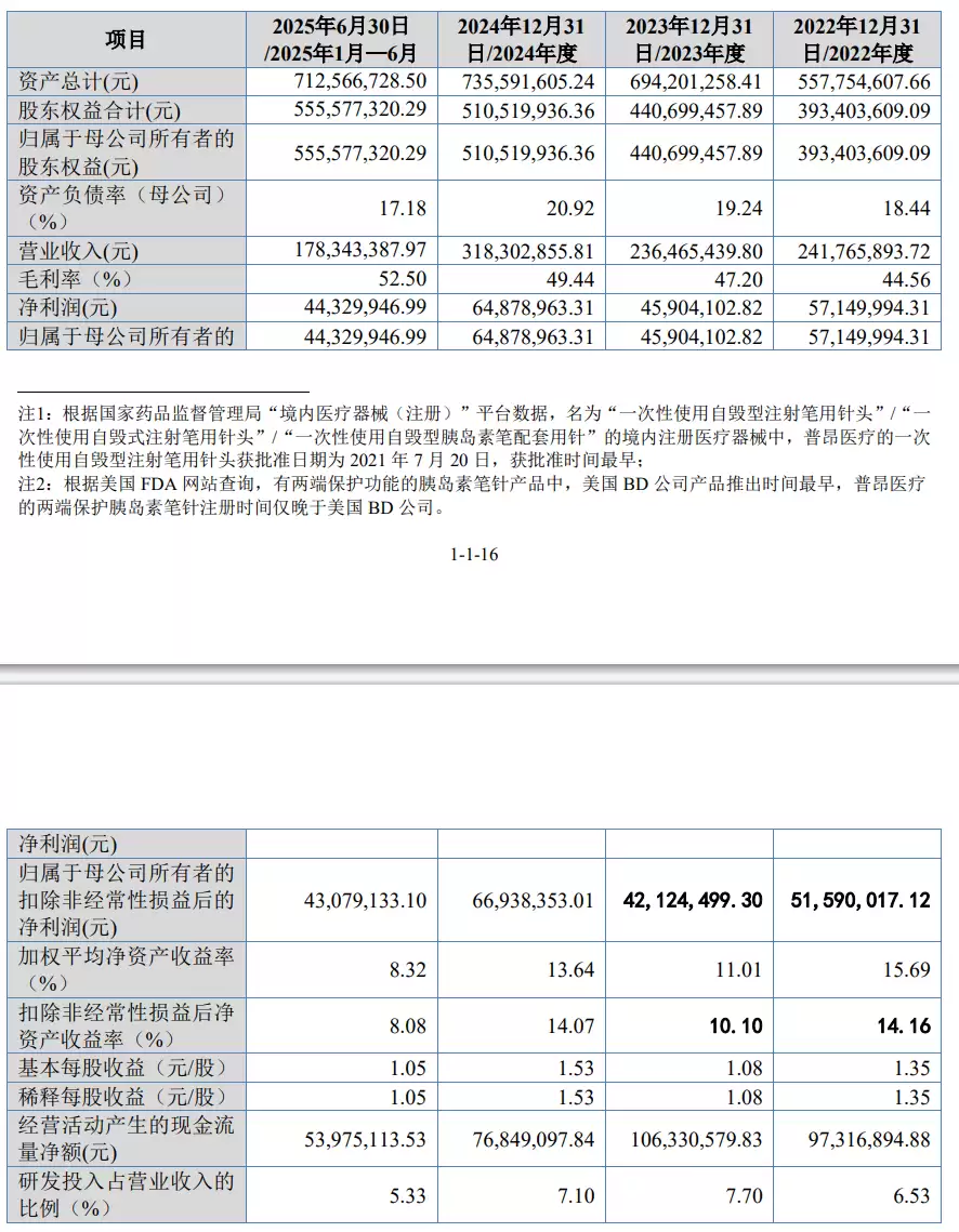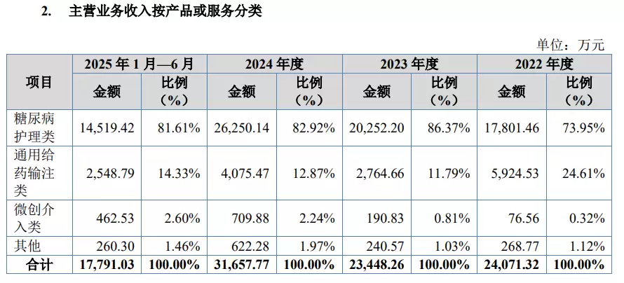 财务数据显示,2024年至2025年上半年,公司营业收入分别为2.42亿元、2.36亿元、3.18亿元和1.78亿元,净利润分别为5715万元、4590.41万元、6487.9万元和4432.99万元。其中,糖尿病护理类产品贡献了主要收入,报告期内占比持续保持在73%以上,2025年上半年仍达81.61%。该类产品收入从2024年的1.78亿元增长至2024年的2.63亿元,2025年上半年实现1.45亿元,展现出稳健的增长态势。