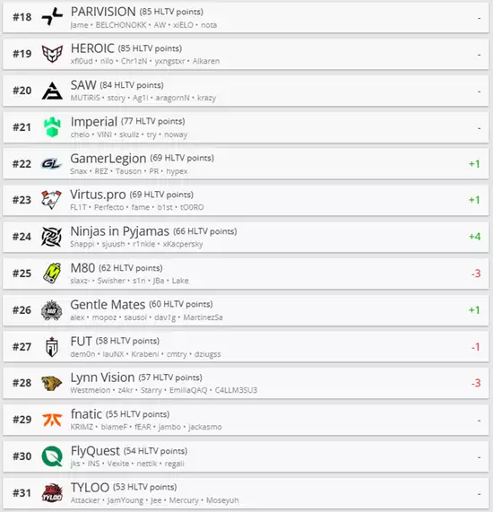 再看21-30名,排名提升最大的是Ninjas in Pyjamas,他们一举前进了四位,来到了第24名。而下滑最显著的M80和Lynn Vision则各自后退了三位,其中LVG排名第28位,即将跌出TOP30战队之列。与此同时,TYLOO继续稳定在第31位,成为了TOP30之外的头号队伍。
