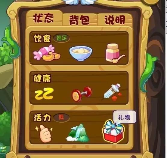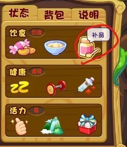 4、亲密度清零后,我们首先点击“食物-补品”给宠物喂金豌豆(4个)。
