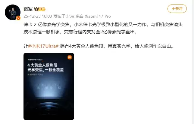 小米科技创始人雷军近日在社交媒体上透露了一则重磅消息:即将发布的小米17 Ultra将全球首发搭载与徕卡联合研发的2亿像素光学变焦镜头。这项突破性技术被定义为“移动影像光学小型化的里程碑式创新”,其核心架构直接承袭了专业相机的光学系统。