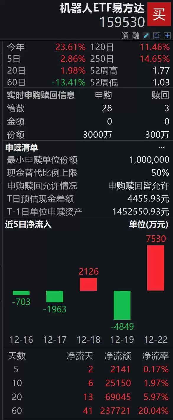 从资金流向来看,追踪该指数的机器人ETF易方达(159530)持续获得市场青睐。近10个交易日累计吸引资金超过2.5亿元,而最近20日的资金净流入规模更是突破6.9亿元大关。根据最新统计,该基金规模已达126.79亿元,成为同类产品中唯一规模突破百亿的ETF基金。当日盘中数据显示,该ETF获得2700万份净申购,显示出投资者对机器人产业长期发展前景抱有信心。