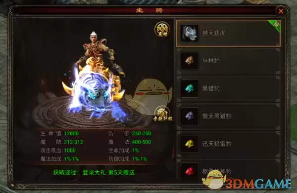 撼天猛虎(登录大礼-第5天赠送)、丛林豹(福利大厅-每日礼包获取)、黑猎豹(由丛林豹合成)、傲天黑猎豹(由黑猎豹合成)、迅天猎雷豹(由傲天黑猎豹合成)、熬雷绝神豹(由迅天猎雷豹合成)、邪影银月狼(由熬雷绝神豹合成)、赤影银月狼(由邪影银月狼合成)、血影银月狼(由赤影银月狼合成)