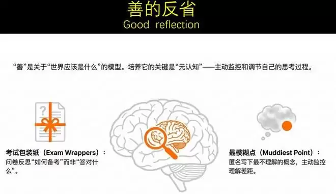 什么叫元知识?就是思考你是怎么思考的,控制你的思维过程。因为所谓的善,就是控制自己的过程。它给了我两个实验,一个是“考试包装纸”,你要思考的不是为什么你答错了,而是去想,你为什么会这样去想这个问题?第二个是“最模糊观点”,匿名写下你最不理解的描述,然后看看你跟理解的差距。它教你什么?教你自我反省。