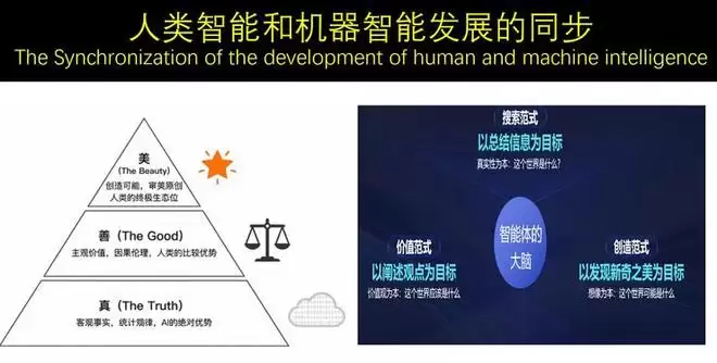 首先我给了它一张PPT。我提出,大模型今天要回答什么问题,比如这个世界是什么?下一步,阐述观点。以此类推,最后大模型给了这样一张图:第一个观点是真(客观事实,统计规律,AI的绝对优势),第二个观点是善(主观价值,因果伦理,人类的比较优势),最后一个观点是美(创造可能,审美原创,人类的终极生态位)。这就是人类与AI的同步进化。