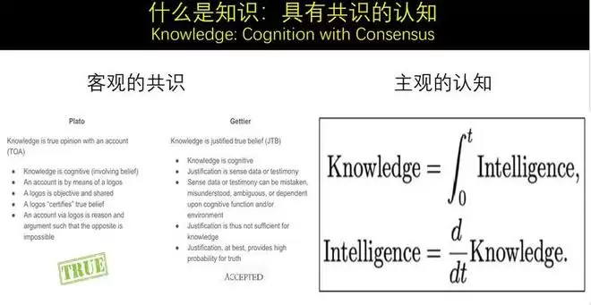 首先,知识是认知,这一点毫无疑问。两千多年来,很多哲学家们都是这么定义的。其次,知识还有一个很大的特点是verify(验证、核实、证实),既然是共识,你要同意/确认它。在古代,确认它不太容易,主要靠辩论,这就是过去的柏拉图时代,所以才会有议会制度的整套系统,通过辩论得到共治,像亚里士多德,都是这种人。