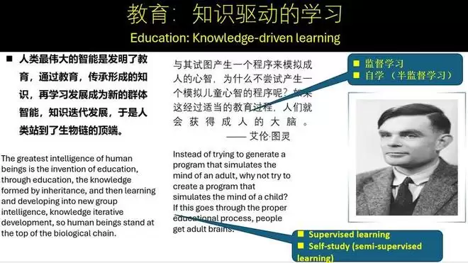 现在又有一个新的有趣的想法出现,你不要忘记,大模型是我们教的,所以我们在教育孩子的同时还在教育一样东西,就是我们的机器、智能体。从这个角度来讲,实际图灵讲过很多话,图灵有一个观点,是他对人工智能的最大贡献。他认为,对人工智能能力的培养,应该像教育小孩一样,这是他最有名的一个观点,而这个观点,现在恰恰没有多少人注意。