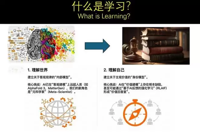 3、学习有两个意义:理解世界(客观建模),理解自己(价值建模)。现在的核心挑战是:机器在客观建模上已经开始超越人类。