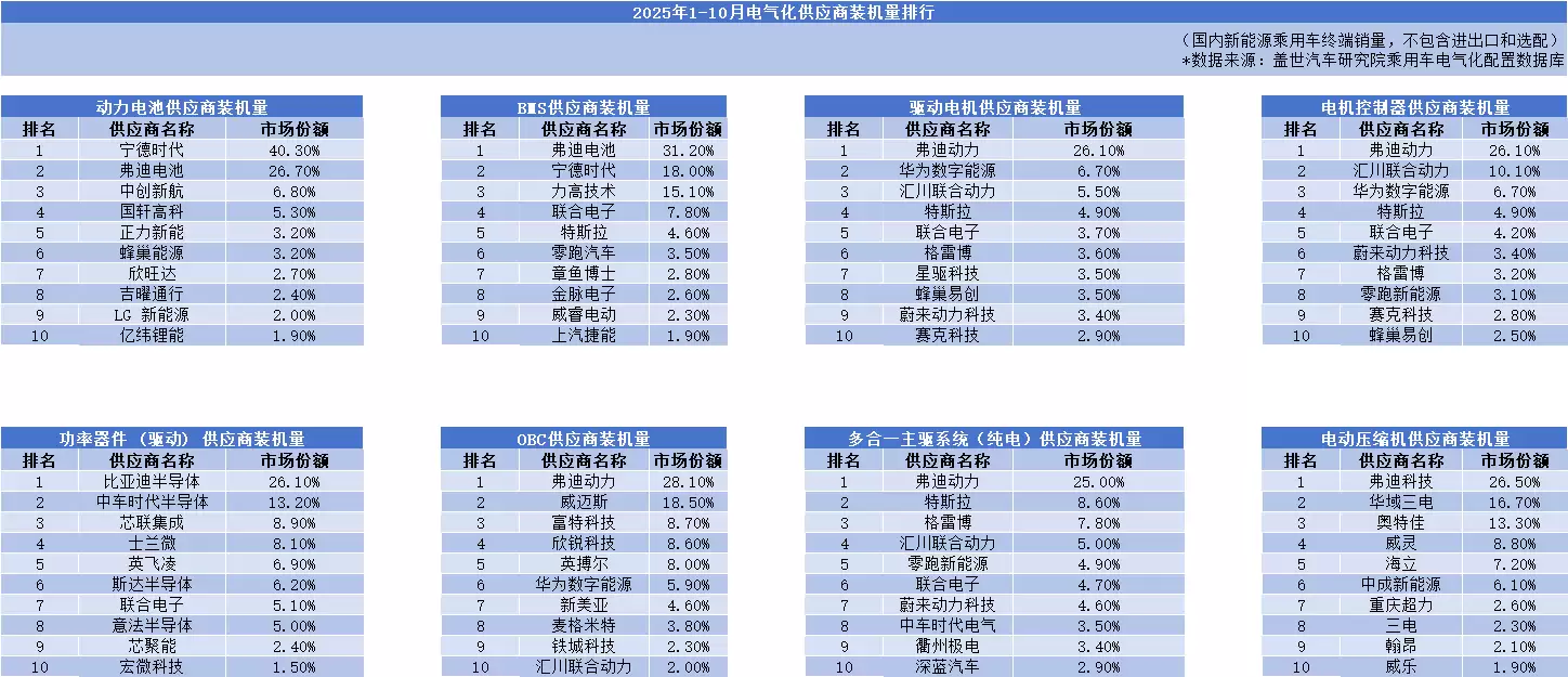 根据盖世汽车发布的2025年1-10月电气化供应商装机量排行数据,比亚迪旗下的弗迪电池、弗迪动力等子公司,在动力电池、驱动电机、电控系统等核心部件的装机量榜单上,几乎都稳居榜首,充分彰显了比亚迪作为行业顶级核心零部件供应商的综合实力。