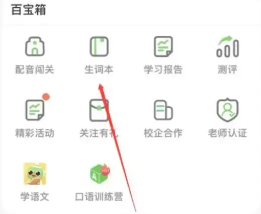第一步:启动手机上的《少儿趣配音》App,登录账号后,在应用首页定位并点击【生词本】入口。