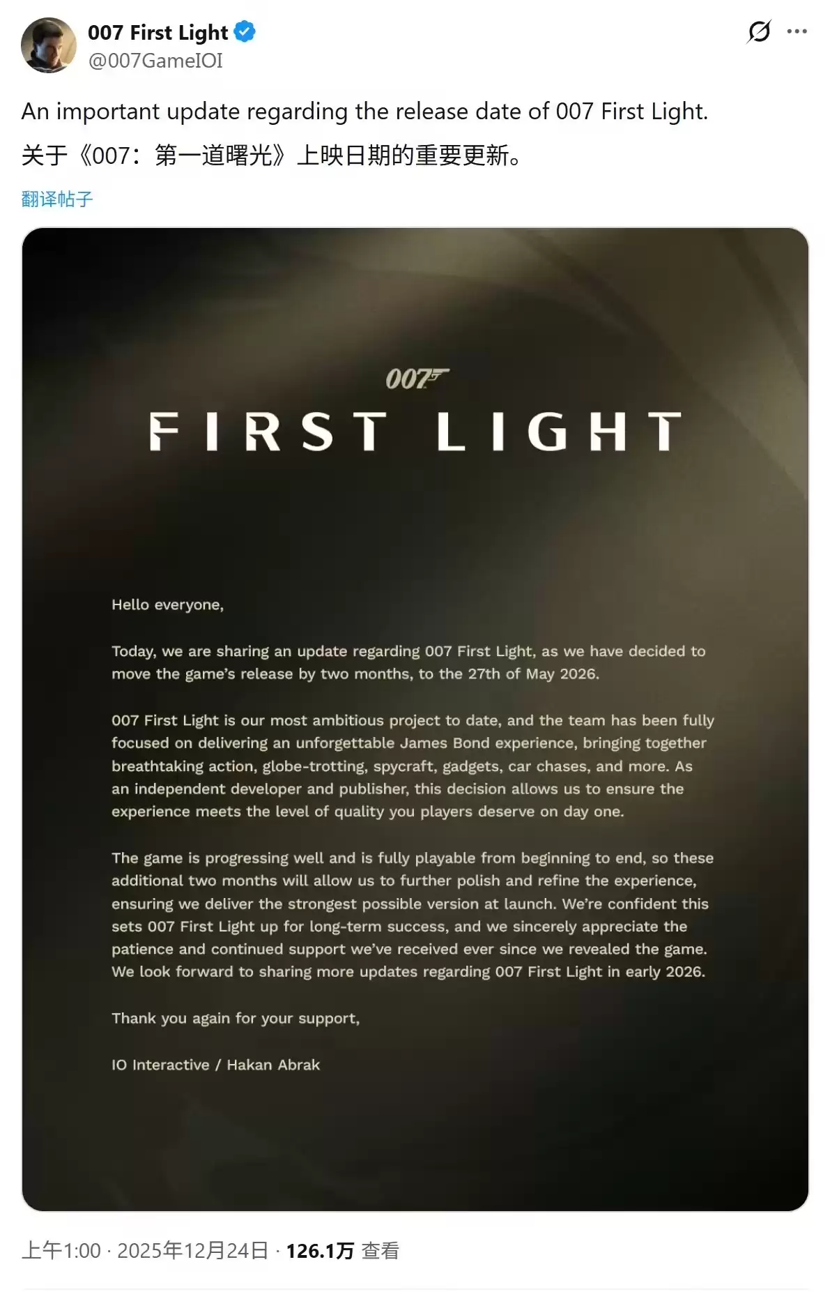 12月24日消息,《杀手》(Hitman)系列游戏开发商IO Interactive于今日宣布,旗下备受期待的詹姆斯·邦德题材新作《007:初露锋芒》(007: First Light)将延期至2026年5月正式发行。