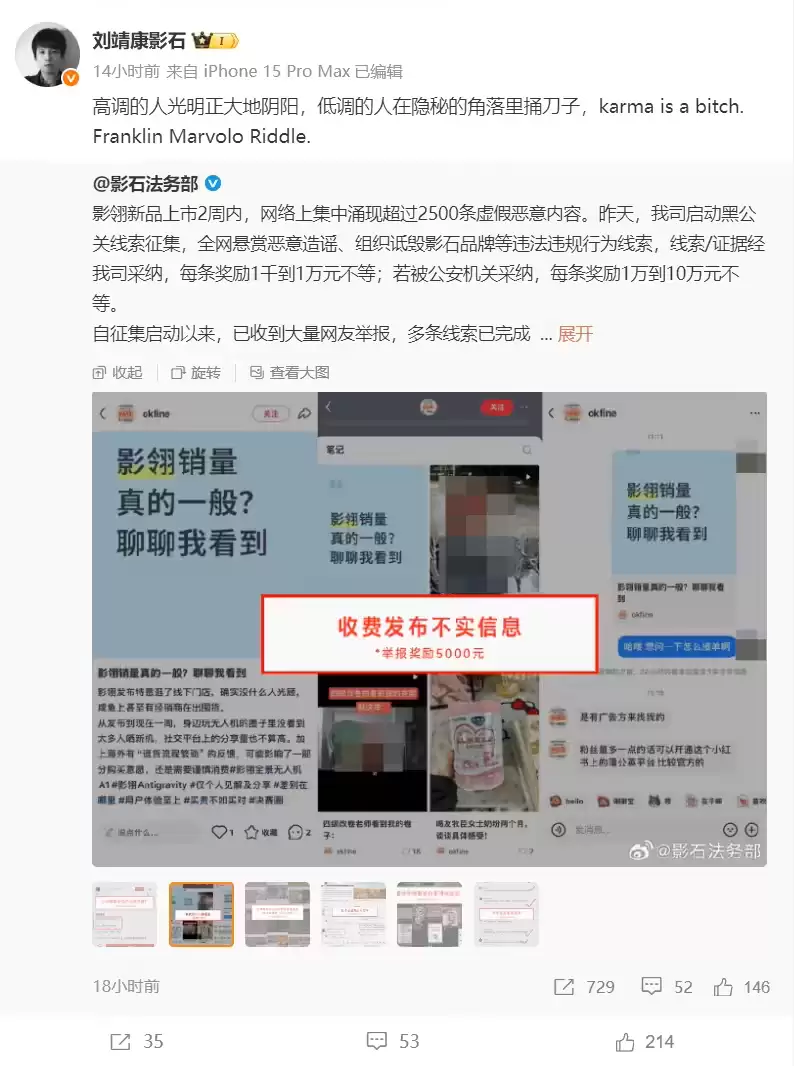 12月23日,影石 Insta360 的CEO刘靖康转发该博文并评论道:行事高调的人在光明磊落地进取,行事低调的人却在隐秘的角落里捅刀子,karma is a bitch. Franklin Marvolo Riddle.