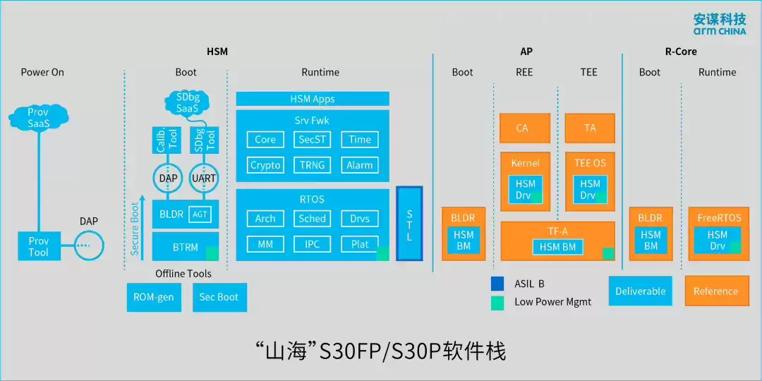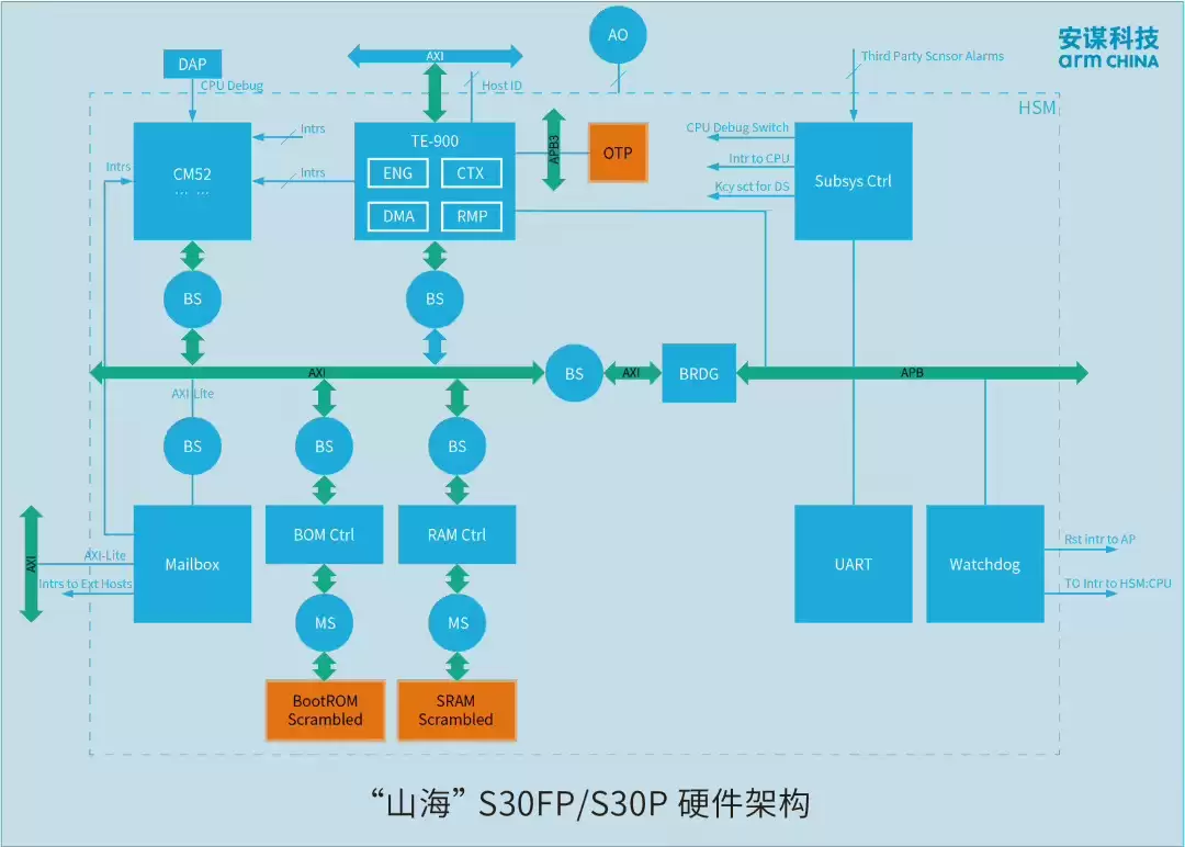 此外,“山海”S30FP/S30P能够与Arm架构无缝融合,支持Arm TrustZone、虚拟化等底层安全架构,与Arm的底层安全架构同源互补,形成系统协同,从而激活整个Arm安全体系的能力,建立起完善的芯片安全体系。