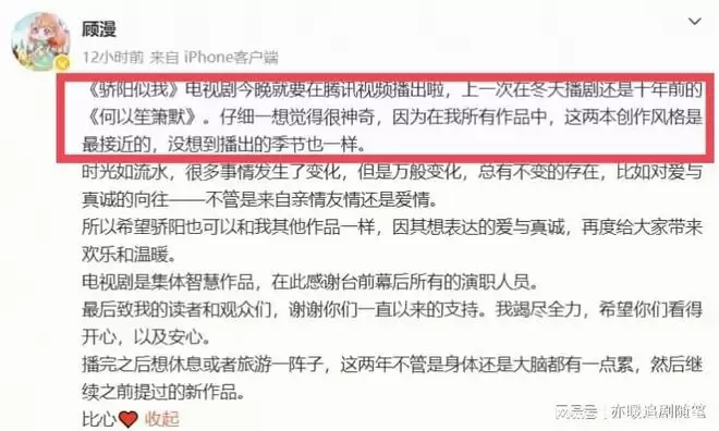 开播前,顾漫还特意发微博官宣,说这部剧的风格和10年前的《何以笙箫默》很像,而且播出的季节也一样。