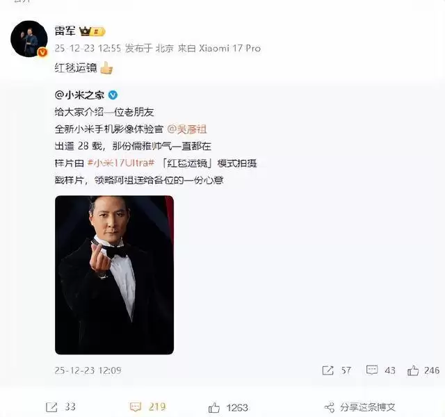 小米影像体验官吴彦祖上任,雷军点赞17 Ultra红毯运镜