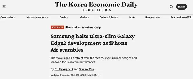 近日,有知情人士向《韩国经济日报》透露,由于苹果公司最新推出的iPhone Air市场反响平淡,三星电子已重新评估超薄智能手机的商业前景,并决定暂停开发下一代超薄机型Galaxy Edge2。