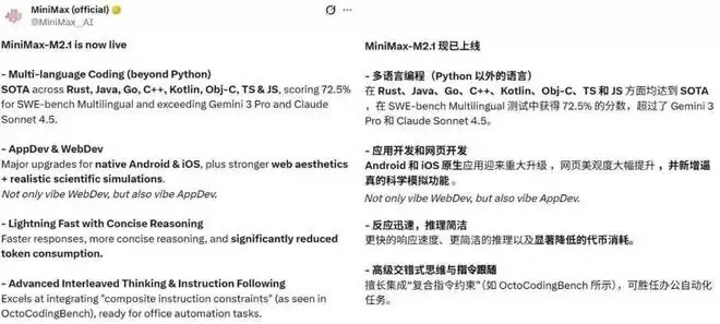 资本市场的喧嚣还没结束,23 日,MiniMax 又反手甩出了一张技术牌:正式上线MiniMax M2.1模型。