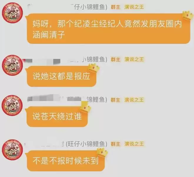 而后,业内人士爆料称“纪凌尘经纪人发朋友圈内涵阚清子”,言语恶毒,发布了诸如“都是报应”、“苍天饶过谁”、“不是不报时候未到”等突破道德底线的言论。