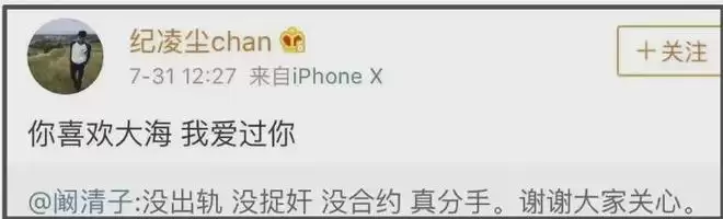 说回纪凌尘和阚清子这段感情,外界普遍认为过错方是男方,因为他回避阚清子30岁结婚及“女强男弱”等观念,从而导致分手。但纪凌尘在阚清子发文宣布分手后,转发表达深情写道“你喜欢大海,我爱过你”,遭吐槽是“渣男语录”,从而得花名“大海哥”。