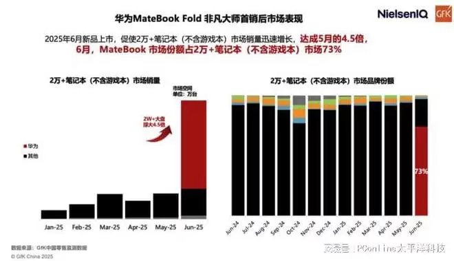 作为鸿蒙生态在个人计算领域的重磅力作,华为MateBook Fold 非凡大师便以颠覆传统的使用体验赢得市场青睐。上市首月,华为MateBook Fold 非凡大师就推动2W+高端笔记本市场销量暴涨至5月的4.5倍,拿下73%的市场份额,用数据印证了用户对其的认可。
