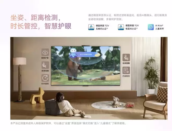 此外,针对家庭用户高度关注的儿童使用场景,华为 Vision 智慧屏 5 SE在 “健康守护”与“优质内容”两方面做到了深度融合。内容层面,华为视频“少儿专区” 提供涵盖动画、儿歌、早教、科普、绘本等在内的丰富资源,让电视成为寓教于乐的家庭学习平台;护眼方面,依托AI 摄像头的坐姿 / 距离检测功能,当孩子观看距离过近或坐姿不端正超过 6 秒时,屏幕会自动弹窗提醒并暂停播放,全方位呵护孩子的视力健康。