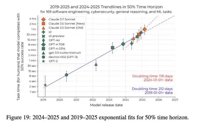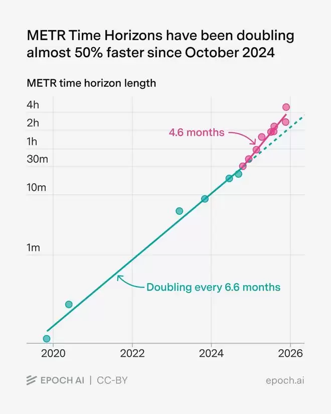 结果显示:自2024年4月开始,AI 能力增长速度明显加快——比之前的增长速度快了近一倍!