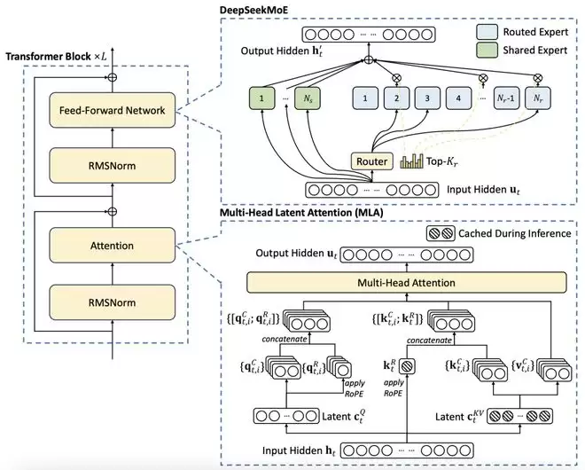 三个技术是,多头潜在注意力(MLA)、混合专家(MoE)架构的改进,以及多token预测机制。