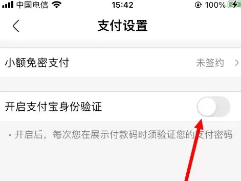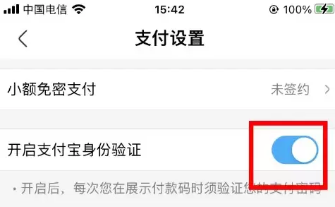 接下来,在支付设置页面里,您会看到【开启支付宝身份验证】的选项,直接点击它。