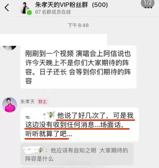 结果阿信的体面,被朱孝天认为是表面功夫。事后在粉丝群继续内涵,称阿信在外面说了好几次,但他本人没有收到任何消息,吐槽阿信说的是场面话,听听就算了。