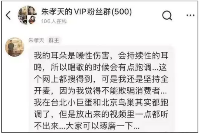 朱孝天向粉丝解释称,他的耳朵是噪性伤害,会持续性的耳鸣,所以唱歌的时候会有点跑调,可是他还是坚持全开麦,因为他觉得不能欺骗消费者。而在台北小巨蛋和北京鸟巢的两场合体演出,其实都有跑调,但是放出来的视频里一点都听不出来。朱孝天让大家琢磨一下原因。