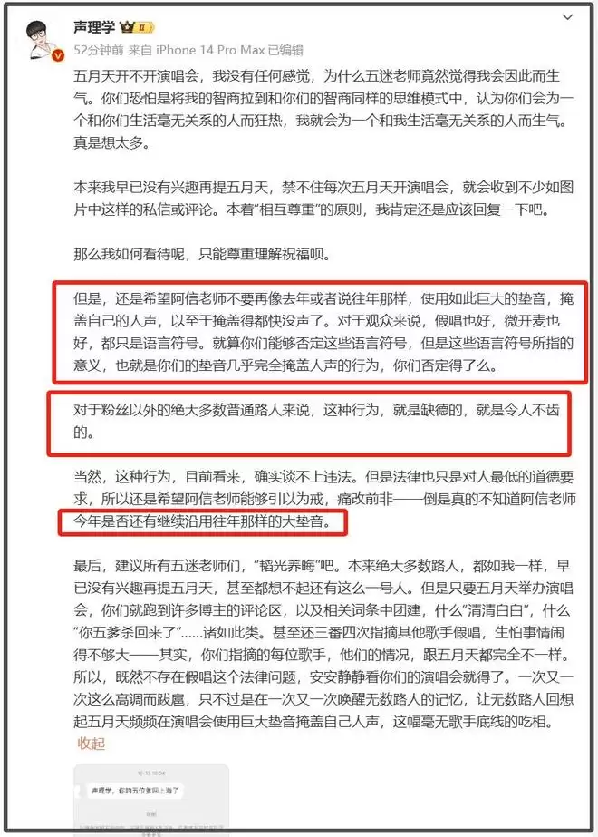 当然,也有网友认为朱孝天说的没错,假唱就是错的,不应该欺骗消费者。其实朱孝天内涵相信音乐造假,这一波也是很戳心窝子了。去年五月天卷入演唱会假唱风波,被扒各种大垫音和半开麦,垫音几乎完全掩盖了人声,尽管事后上海相关部门调查,称不存在假唱,但关于大垫音算不算假唱,半开麦开多少算真唱,这里的漏洞太多,网友并不买账,五月天口碑也因此饱受争议。