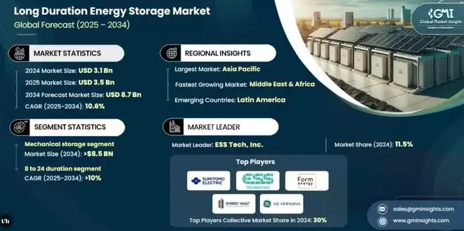 这些都指向了长时储能市场的重要性。根据 Global Market Insights 的数据,全球长时储能市场 2024 年规模为 31 亿美元,2025 年预计达到 35 亿美元,到 2034 年将增长至 87 亿美元,年复合增长率达到 10.6%。