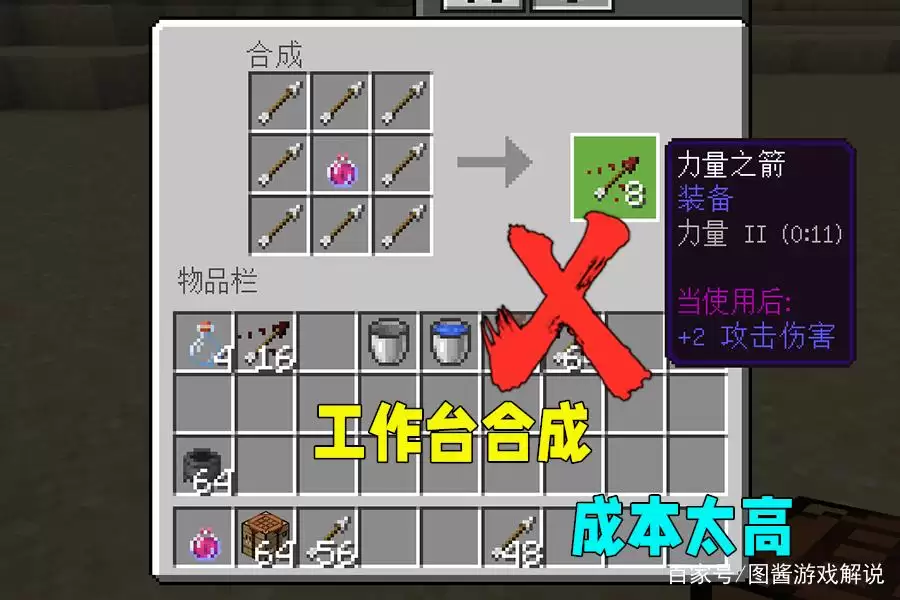 第三种方法是使用工作台合成,但每瓶药水只能制作8根箭矢,相当于3瓶药水只能产出24根,转换效率远不如炼药锅。更重要的是,在工作台合成药水箭需要用到滞留型药水,这就需要去末地收集龙息,成本会进一步提高。