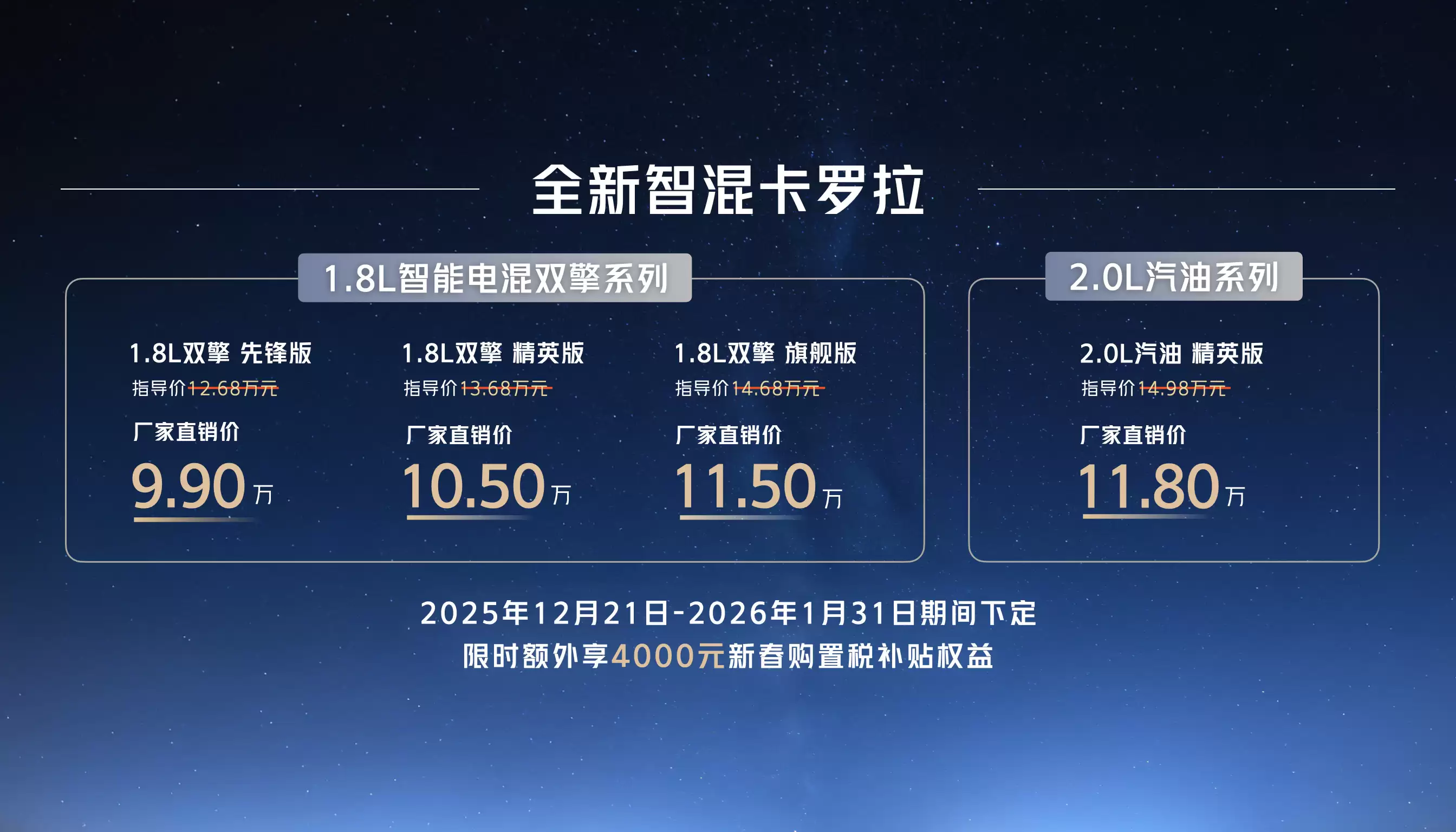 全新智混卡罗拉上市:空间、科技、安全进阶,售价9.9万元起