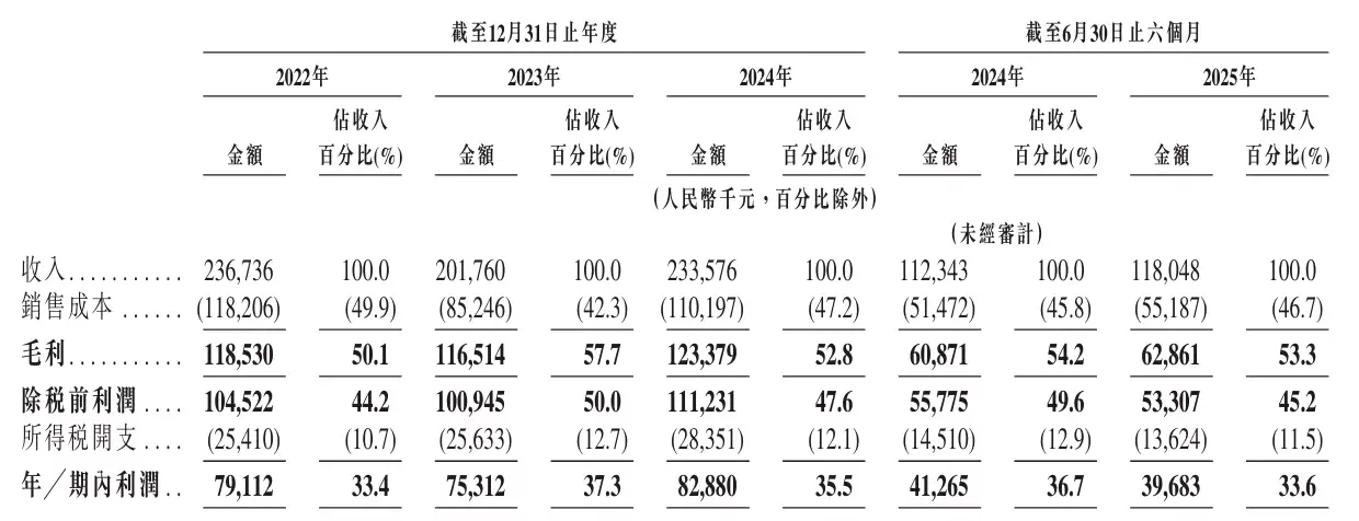 从财务数据来看,红星冷链在过去几年展现出较为稳健的经营态势。2022年至2024年,公司营收分别为2.37亿元、2.02亿元和2.34亿元。同期,毛利润分别达到1.19亿元、1.17亿元和1.23亿元,对应的毛利率依次为50.1%、57.7%和52.8%。在利润方面,年内利润分别为7911万元、7531万元和8288万元,年内利润率则分别为33.4%、37.3%和35.5%。