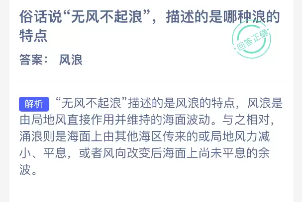 支付宝神奇海洋今日答案:无风不起浪描述的是哪种浪?