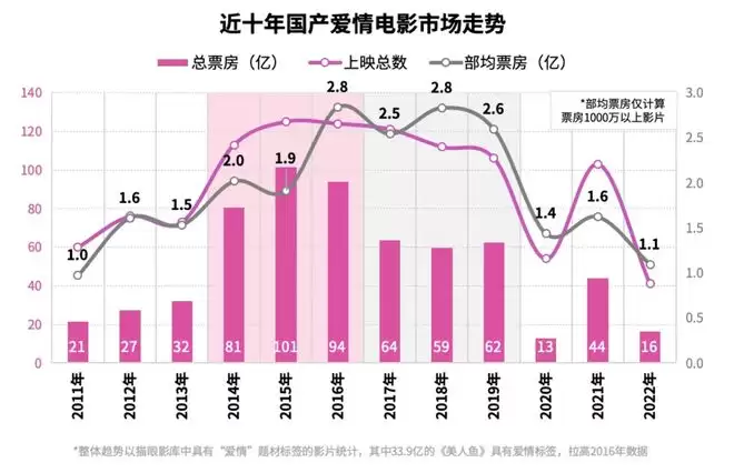 从这一类型电影的整体数据来看,数量、票房和观影人次的大幅下滑昭示着,爱情片不仅远离了创作中心,也丧失了对观众的吸引力。