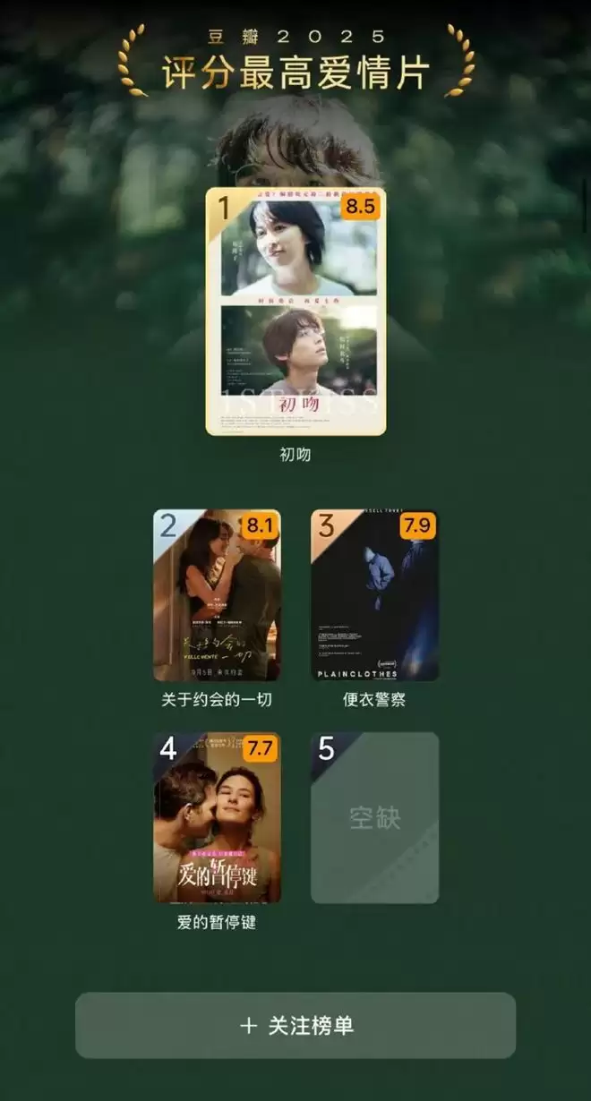 当然最惨淡的还要属爱情片,2025评分最高的爱情片连五个名额都凑不齐,真是一只手都数得过来,而榜单上仅有的四部高分爱情片均为进口片,国产电影“竟然是零诶”!